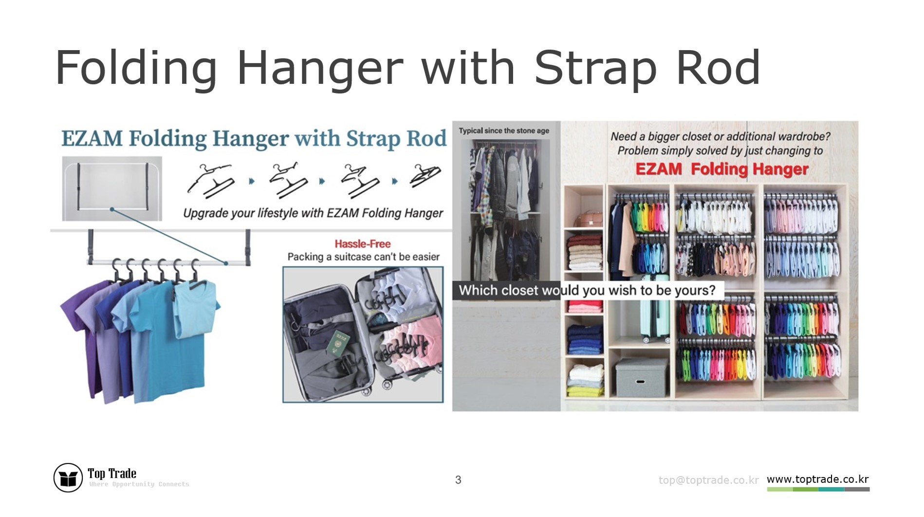 No more folding and unfolding when you travel. From the wardrobe straight into a suitcase and from the suitcase to wardrobe at the hotel without folding and unfolding.